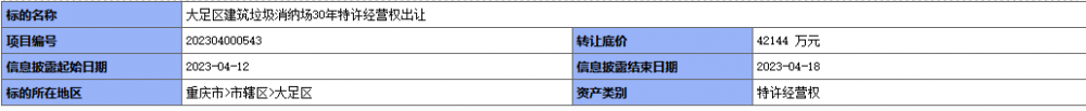 轉(zhuǎn)讓底價(jià)4.2億!重慶大足區(qū)建筑垃圾消納場(chǎng)30年特許經(jīng)營(yíng)權(quán)出讓