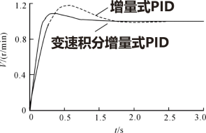 根據(jù)電機(jī)模型的傳遞函數(shù),通過計(jì)算機(jī)繪制系統(tǒng)在不同PID 控制方式下的階躍響應(yīng)曲線,從圖3階躍響應(yīng)仿真結(jié)果可知,采用變速積分增量式PID 控制可以避免普通增量式PID 控制所產(chǎn)生的過大超調(diào)并提高了電機(jī)調(diào)速的快速性,其達(dá)到勻速的時(shí)間為0.3s,而普通增量式PID 控制算法達(dá)到勻速的時(shí)間為0.5s,因此采用變速積分增量式算法,系統(tǒng)具有動(dòng)態(tài)響應(yīng)快、控制穩(wěn)態(tài)性能好,并能很快趨于穩(wěn)定的特點(diǎn),適用于電機(jī)調(diào)速系統(tǒng)的高速控制。