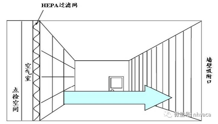通過(guò)凈化車(chē)間屋頂?shù)母咝н^(guò)濾器出口向屋內(nèi)送風(fēng).通過(guò)墻壁的排氣口回風(fēng),以玻璃纖維為主