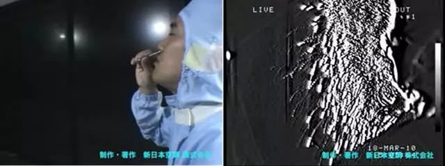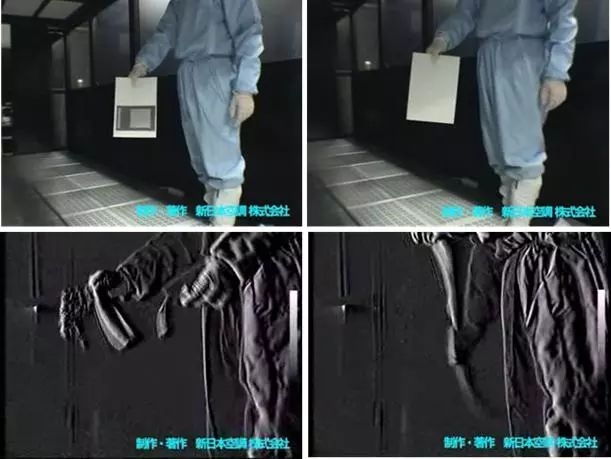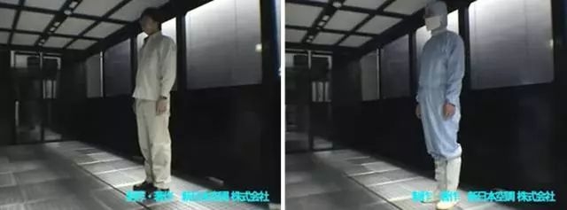 左邊是穿一般的工作服走路時候發(fā)塵的樣子。右邊是穿潔凈服走路時候發(fā)塵的樣子。