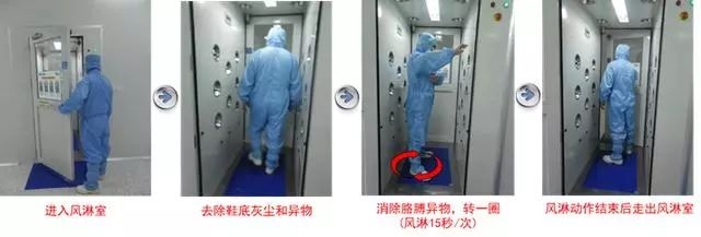 注:正確使用風淋室,能夠減少帶入室內(nèi)的灰塵。正確聽從風淋室播音員的指示進行操作,夠去除95%的1μ以上的灰塵。