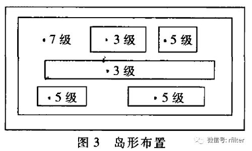 1.1 無塵車間從平面布置劃分一般有三種形式:即開放式( ballroom type)、港灣式(baycliasetype)、島形布置(island type),如圖1、2、3。