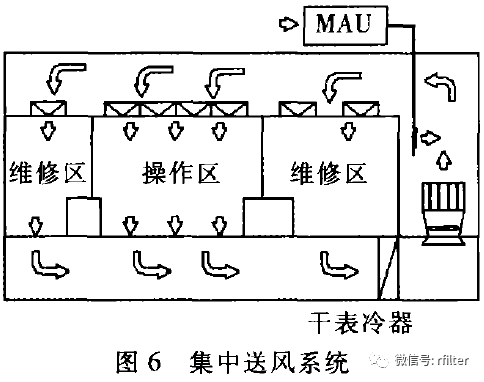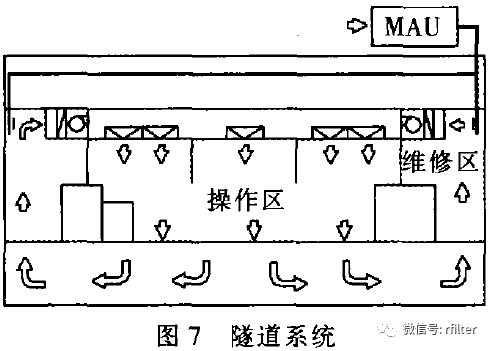 1.2無塵車間從送風(fēng)系統(tǒng)方式劃分一般也有三種形式:即集中送風(fēng)系統(tǒng)(central system)、隧道系統(tǒng)(tunnel systerm、FFU系統(tǒng)(fan filter unitsystem),如圖6、7、8。