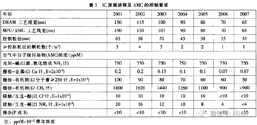 隨著lC生產(chǎn)的飛速發(fā)展,其加工的特征尺寸越來越微細(xì)化,去除空氣中的AMC( airbome molecular contamination)問題越來越受到人們關(guān)注,國際半導(dǎo)體制造技術(shù)協(xié)會(SEMATECH)及其他機構(gòu)、組織對IC生產(chǎn)中AMC的危害和允許濃度分別進行了分析預(yù)測,表l是SEMATECH所預(yù)測的國際半導(dǎo)體發(fā)展進程及相應(yīng)的AMC的要求。一些研究結(jié)果表明,空氣中的金屬離子(Na、K、Fe、Cu、Zn等)會破壞絕緣層,使p-n結(jié)漏電;而氮氧化物、二氧化硫、氨、有機物、臭氧、硼、磷等都會引起電路缺陷。AMC已直接影響到產(chǎn)品的成品率和可靠性,所以應(yīng)加以控制。