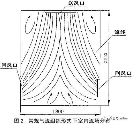 1000 級(jí)無(wú)塵車間常規(guī)送、回風(fēng)方式下造成的室內(nèi)氣流分布見圖2[2]。室內(nèi)大部分區(qū)域, 尤其是工作區(qū)(距地面1 ~ 1 .5 m 左右的區(qū)域)處于主流區(qū)。因?yàn)橥ǔ?/p>