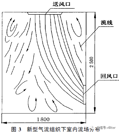 新型氣流組織形式下室內(nèi)流場(chǎng)分布見圖3[2]。因?yàn)?a href="/tags/227.html" >潔凈室www.iwuchen.com內(nèi)較大一部分區(qū)域(包括一大部分工作區(qū))處于渦流區(qū), 所以潔凈度、容積發(fā)塵量與換氣次數(shù)的關(guān)系也即渦流區(qū)濃度、容積發(fā)塵量與換氣次數(shù)的關(guān)系, 該關(guān)系式[1]可表示如下: