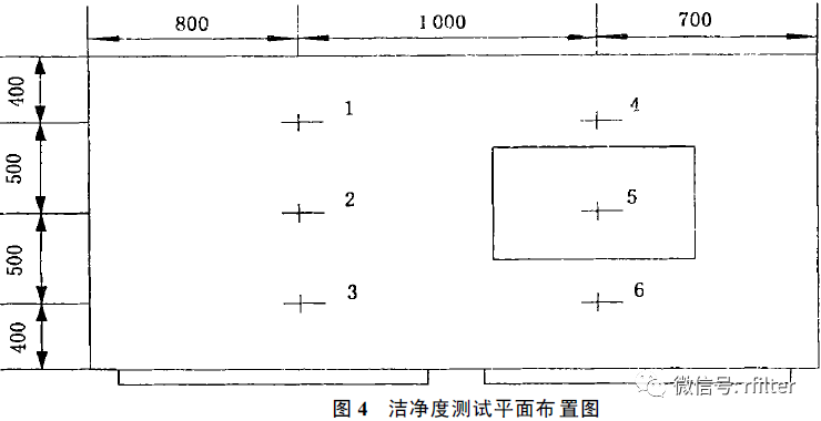 為了證明以上分析的正確性, 對(duì)圖1 所示的無(wú)塵車間潔凈度進(jìn)行了實(shí)測(cè)。測(cè)試是在模擬動(dòng)態(tài)工況下進(jìn)行的。測(cè)試儀器采用Y09 9 型激光粒子計(jì)數(shù)器。在無(wú)塵車間地面以上1.2 m左右的高度布置6 個(gè)測(cè)點(diǎn), 測(cè)點(diǎn)布置見圖4 , 每個(gè)測(cè)點(diǎn)測(cè)3 次, 取其平均值作為最終結(jié)果, 潔凈度測(cè)定結(jié)果見表1 , 測(cè)試時(shí)換氣次數(shù)n 2= 83 次/h 。按規(guī)范規(guī)定, 對(duì)于1000 級(jí)無(wú)塵車間來說, ≥0.5 μm的粒子濃度應(yīng)≤35個(gè)/L[3]。由測(cè)定結(jié)果可知, 無(wú)塵車間潔凈度完全滿足1000 級(jí)的要求, 證明新型氣流組織形式是適用的。