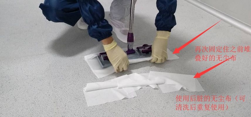 接著我們把無塵布一片一片堆疊成可以包裹住平板拖把的合適大?。ūM量是9寸的無塵布),并用平板拖把后側(cè)的固定夾固定住無塵布。(盡量多疊幾層,方便更換)