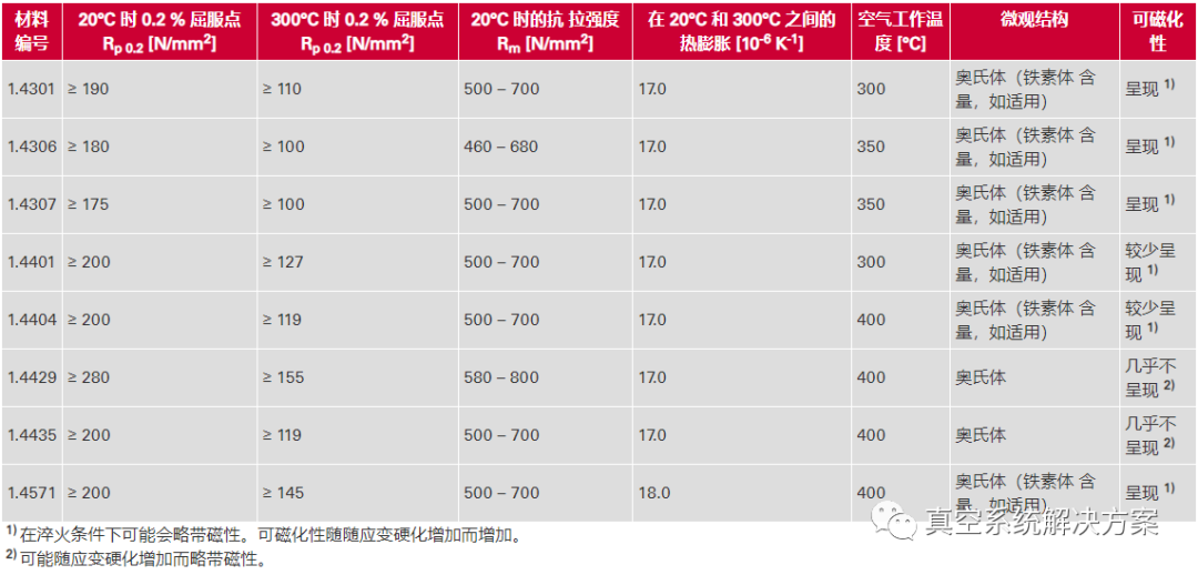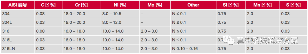 歐洲常用鋼號(hào)可與AISI(美國(guó)鋼鐵協(xié)會(huì))類似材料名稱通用,如1.4301對(duì)應(yīng)304、1.4307和1.4306對(duì)應(yīng)304L、1.4404和1.4435對(duì)應(yīng)316L以及1.4429對(duì)應(yīng)316LN。不過(guò),材料只是大約類似。真空應(yīng)用的差異大多是非常微小的。然而,對(duì)于特殊要求,必須針對(duì)個(gè)別情況單獨(dú)評(píng)估通用性。示例:如果某個(gè)部件需要材料1.4301,一般必須有相關(guān)材料證書。如果證書只顯示材料304,則未滿足要求。此時(shí),證書中的名稱很重要。如果滿足相應(yīng)的材料規(guī)格,制造商也可證明半成品具有幾個(gè)名稱。例如,如果材料被證明為1.4301、1.4307、304和304L,用途則會(huì)更加多樣化。