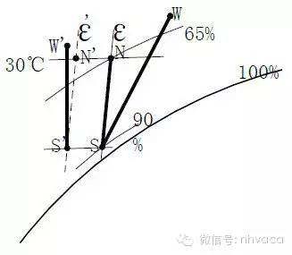 (2)室外空氣狀態(tài)點(diǎn)(W’)含濕量dW’小于假設(shè)送風(fēng)狀態(tài)點(diǎn)(S)的含濕量ds時(shí),按下式計(jì)算: