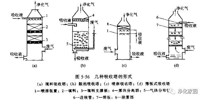 在產(chǎn)品生產(chǎn)中的濕法化學(xué)腐蝕、酸液清洗、實驗室內(nèi)均有酸性氣體排出,在這類酸性氣體的排風(fēng)系統(tǒng)通常設(shè)置溫式洗氣吸收塔,處理后排入大氣,圖5-56是幾種吸收式洗氣塔的形式。實際設(shè)計時應(yīng)根據(jù)酸性氣體的類型、濃度選用合適的吸收液和吸收塔的形式[20]。