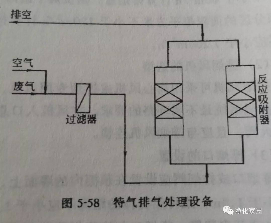 圖5-58是一種特氣處理設(shè)備,首先在催化反應(yīng)段中,將有害成分催化反應(yīng)(燃燒)后,再送入吸附段吸附去除各類催化反應(yīng)生成物,達到排放標準后排入大氣。吸附劑按設(shè)計要求定期再生、活化恢復(fù)吸附能力。