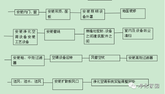 為了保證凈化系統(tǒng)的“干凈”,合理的施工順序具有重要意義,所以規(guī)定“應(yīng)根據(jù)‘潔凈室主要施工程序’制訂協(xié)作進(jìn)度計(jì)劃,嚴(yán)格