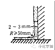 ④踢腳板“應(yīng)與墻面平齊或略縮進(jìn)2~3mm。當(dāng)踢腳板與地面材料相同時(shí)可做成小圓角,其圓角半徑R應(yīng)大于等于50mm",見圖2。