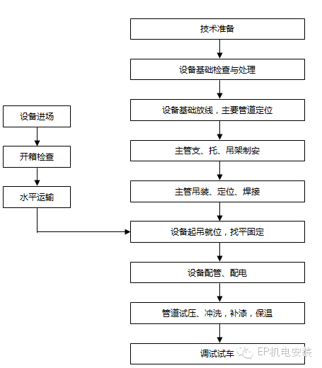 大型冷凍機(jī)房的安裝工藝順序在解決了相關(guān)的技術(shù)問題后,施工工藝流程圖可以表述如下圖: