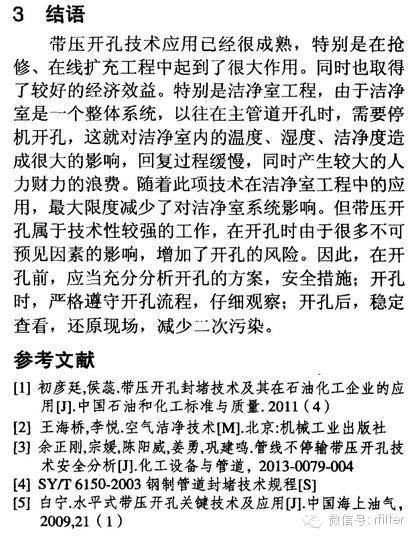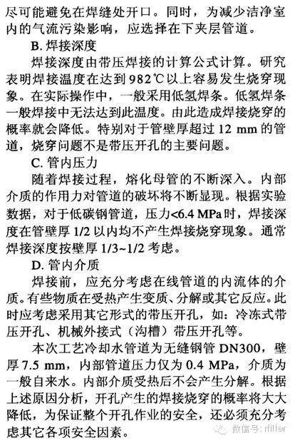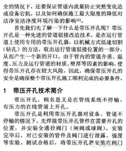 摘要:潔凈室運(yùn)行后,由于生產(chǎn)工藝的改變,產(chǎn)能的擴(kuò)充,需要對原在線工藝?yán)鋮s水管道系統(tǒng)進(jìn)行開孔。原在線管道在沒有預(yù)留閥門的條件下,采用帶壓開孔技術(shù)是提高效率、降低成本的重要技術(shù)。而帶壓開孔技術(shù)受到管內(nèi)壓力、溫度、壁厚等因素的影響,造成帶壓開孔施工存在一定的施工風(fēng)險。