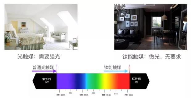 普通光觸媒需要可見光甚至紫外光才能發(fā)生反應(yīng),而鈦能觸媒對光線要求低,只要有空氣就能分解有害氣體。