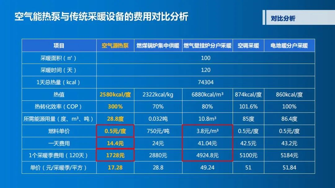 關(guān)于消費者最關(guān)心的電費問題,根據(jù)上表可知,以北方普通家庭為例,采暖面積為100㎡,一年采暖季為120天,使用燃氣壁掛爐1天需花費約41元,按照3.8元/m3來算,4個月供暖期總費用約4900元,而派沃空氣能1天費用約14元,4個月供暖期總費用約1700元。因此,顯然使用空氣能更節(jié)能更省錢。