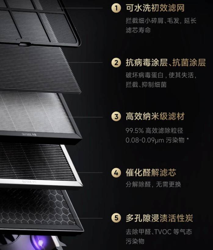 然后,空氣會進入高效納米級濾材層,這個層可以高效濾除 0.08-0.09μm 的污染物,可以有效去除細菌、病毒、花粉等微小顆粒。接著,空氣會經(jīng)過催化醛解濾芯,這個濾芯可以分解甲醛等有害氣體,無需更換。