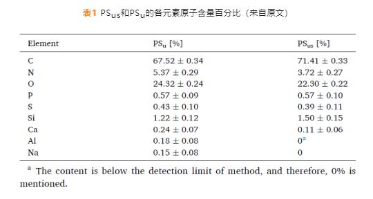 PSus和PSu中C、O、N和P的含量差異較小,PSus中金屬含量顯著降低(Al:0.18% →0;Na:0.15% →0;Ca:0.24% →0.11%),可能是由于CTAB與剩余污泥中的金屬離子發(fā)生作用,CTAB作為污泥細胞表面化學修飾劑,替代細胞表面疏水陰離子基團,結(jié)合細胞表面的陽離子(Al3+、Ca2+、Na+)。值得說明的是,EPS中含有的無機物如金屬鹽類常常被研究者所忽視,無機物的存在將影響PSs的理化性質(zhì),故PSus可能比PSu具有更優(yōu)越的性能。