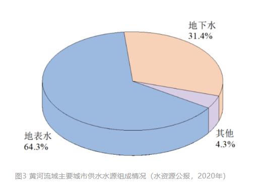 2020年黃河流域68個主要城市供水總量為675億m3,其中地表水為主要的供水水源,為434億m3,占總供水量的64.3%;地下水供水量為212億m3,占總供水量的31.4%;其他水源(包括再生水、集雨工程、海水淡化等)為29億m3,占總供水量的4.3%。