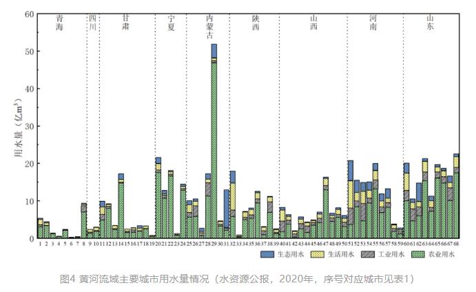 如圖2和3所示,位于青海、四川、甘肅、寧夏和內(nèi)蒙古等?。ㄗ灾螀^(qū))的黃河流域絕大多數(shù)主要城市,其主要供水水源為地表水。位于河南和山東省的城市大部分依賴于地下水供水。鄭州、西安、濟寧、濟南和太原等城市其他水源亦占供水總量的較大比例。