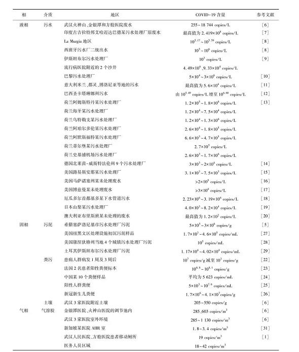 新冠病毒隨著醫(yī)院廢水、市政污水等排放后,經(jīng)污水管道最終進(jìn)入污水處理廠。一方面,新冠病毒通過吸附與解吸作用實(shí)現(xiàn)在水相與固相間的相互遷移。另一方面,病毒會(huì)隨著廢水中顆粒的霧化溢出至氣溶膠內(nèi),并隨著氣溶膠的沉降作用又將新冠病毒重新帶回污水以及土壤中(圖1)。各國研究者為更好防控疫情,研究新冠病毒在不同介質(zhì)中的賦存特征,檢測(cè)并定量新冠病毒的濃度范圍,分析新冠病毒的傳播能力與影響情況。不同介質(zhì)中新冠病毒的分布與濃度如表1所示。