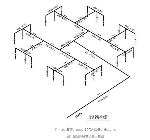 除臭風(fēng)管的冷凝水排放也很重要,尤其對(duì)于不銹鋼管道,如不及時(shí)排放,冷凝水會(huì)融入硫化氫后轉(zhuǎn)變?yōu)槿跛幔瑢?duì)不銹鋼管造成嚴(yán)重腐蝕。因此,設(shè)計(jì)中務(wù)必通過(guò)管道支架的墊片調(diào)整風(fēng)管水平安裝的坡度,設(shè)計(jì)坡度取0.5%~1.0%,冷凝水通過(guò)管道最低點(diǎn)處的排水閥排出。此外,收集干管和支管風(fēng)速設(shè)計(jì)取值不同,分別為6.0~10.0 m/s和4.0~7.0 m/s。