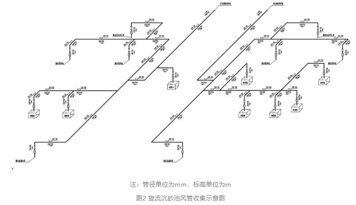 每個(gè)吸風(fēng)口與總管的距離盡量相同是風(fēng)管布置中的一個(gè)基本原則,但實(shí)際應(yīng)用中,由于同程布置導(dǎo)致管路不可避免地出現(xiàn)繞路等現(xiàn)象,很多設(shè)計(jì)人員舍棄了同程設(shè)計(jì)理念,且存在“反正有風(fēng)閥可調(diào)節(jié)阻力”的想法。經(jīng)測(cè)算,雖然風(fēng)閥可以調(diào)節(jié)阻力,但調(diào)節(jié)能力有限,故合理的風(fēng)管布置原則應(yīng)該是對(duì)于收集主管實(shí)現(xiàn)同程布置,支管通過(guò)閥門(mén)調(diào)節(jié)。圖1為小型構(gòu)筑物的風(fēng)管布置,其收集管道基本實(shí)現(xiàn)了同程布局,末端3根支管方面,通過(guò)對(duì)末端CFD模擬后采用中間支管縮徑方式,也實(shí)現(xiàn)了3根支管的阻力一致。圖2為旋流沉砂池的風(fēng)管布置,為主管同程布置的方式。