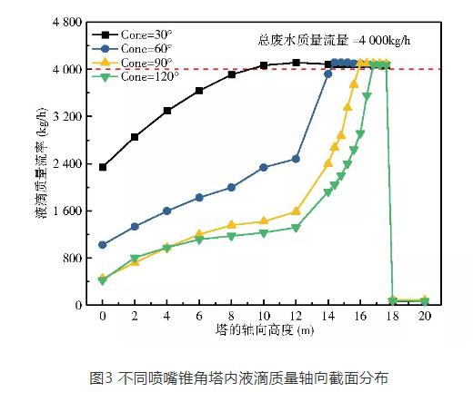 以合川雙槐電廠一期脫硫廢水零排放項(xiàng)目的煙氣余熱濃縮塔為實(shí)驗(yàn)?zāi)P?,分析了不同角度的錐形噴嘴在蒸發(fā)濃縮脫硫廢水時(shí)的蒸發(fā)效率,考察了噴嘴角度對(duì)液滴蒸發(fā)特性的影響規(guī)律。整體上來(lái)看,噴嘴錐角為90°和120°的工況下脫硫廢水的蒸發(fā)效果更高,回落塔底的廢水量小。同時(shí),在噴淋塔設(shè)計(jì)時(shí)要保證蓄水液面與噴淋層的高度至少為10m,才能保證脫硫廢水的蒸發(fā)效率較高。