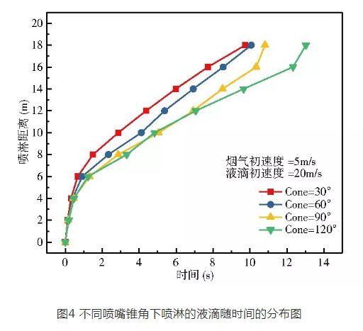 液滴在塔內(nèi)的停留時(shí)間直接影響了其蒸發(fā)效率的高低,利用塔內(nèi)不同高度截面對(duì)廢水液滴進(jìn)行采樣捕捉,統(tǒng)計(jì)液滴到達(dá)各個(gè)截面的所需的平均時(shí)間,圖4即為從噴嘴出口噴淋的液滴隨時(shí)間的分布情況。剛離開(kāi)噴嘴1s左右的時(shí)間,不同噴嘴錐角下的液滴分布較為相近,這是因?yàn)槌跏茧A段液滴的速度衰減主要受液滴初始速度的影響,而液滴之間的分散情況影響較小,而大于2s后,從較小錐角噴淋的液滴分布較為集中,核心處的液滴受煙氣曳力作用降低,依舊能夠保持一定的流速通過(guò)蒸發(fā)空間,降低液滴在塔內(nèi)的停留時(shí)間。
