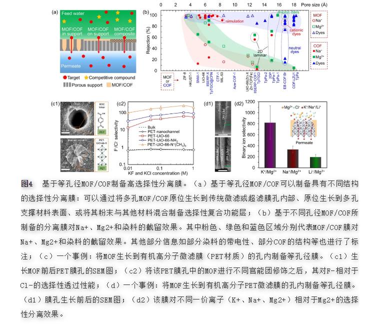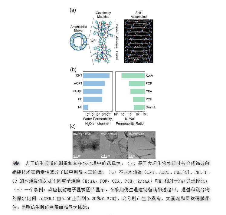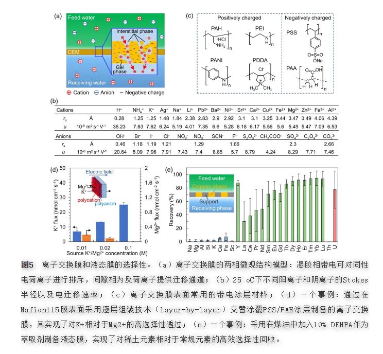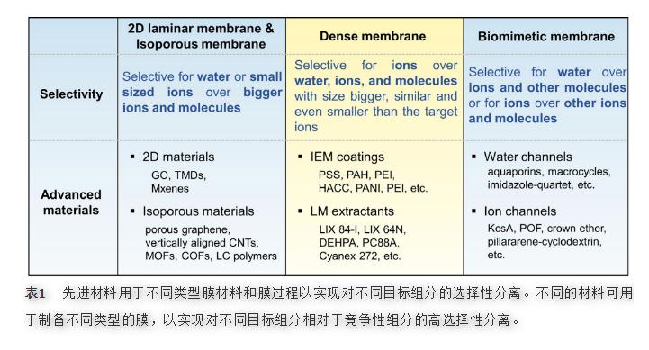 先進(jìn)材料的發(fā)展提高了不同膜材料和膜過(guò)程對(duì)不同目標(biāo)組分(相對(duì)于競(jìng)爭(zhēng)性組分)的選擇性(表1)。其中,二維(2D)材料(如GO、TMD、Mxene)(圖3)和等孔徑材料(如多孔石墨烯、垂直排列CNT、MOF、COF、液晶聚合物)(圖4)可以用來(lái)制備具有層壓結(jié)構(gòu)或者等孔徑結(jié)構(gòu)的水透過(guò)型膜,基于空間位阻效應(yīng)和Donnan效應(yīng)以及RO或NF過(guò)程,實(shí)現(xiàn)對(duì)水或小尺寸離子相對(duì)于大尺寸離子和分子的選擇性分離;離子交換膜涂層材料(如PSS、PAH、PEI、HACC等)和液態(tài)膜萃取劑(如LIX84-I、LIX64N、DEHPA、PC88A等)可用于制備高選擇性離子交換膜(IEM)或液態(tài)膜(LM)等溶質(zhì)透過(guò)型膜(圖5),在電場(chǎng)或濃差為驅(qū)動(dòng)下,基于“溶解-擴(kuò)散模型”原理實(shí)現(xiàn)對(duì)目標(biāo)離子或分子相對(duì)于水或其他競(jìng)爭(zhēng)性離子和分子的選擇性分離。在該類材料中,目標(biāo)離子或分子的尺寸可以小于、等于、甚至大于競(jìng)爭(zhēng)性離子、分子等污染物;仿生水通道(如水通道蛋白、大環(huán)化合物等)和離子通道(如KcsA、POF、CEA、PCH等)材料可以用于制備仿生膜,以實(shí)現(xiàn)水相對(duì)于離子、或者目標(biāo)離子相對(duì)于競(jìng)爭(zhēng)性離子的高選擇性、高通量分離(圖6)。本文對(duì)各類材料的種類、功能和潛力做了詳細(xì)的分析和討論。
