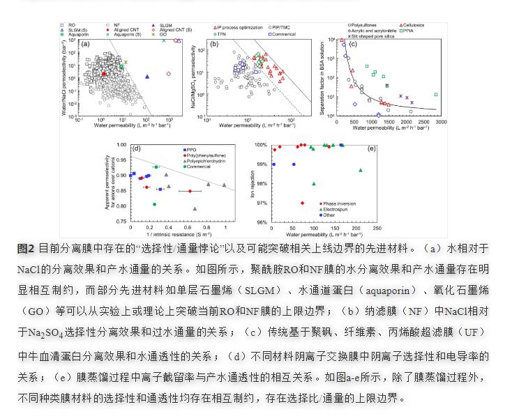 膜分離作為一種性能高、占地小、模塊化設(shè)計(jì)且容易自動(dòng)控制的技術(shù),在水處理領(lǐng)域得到了廣泛應(yīng)用?,F(xiàn)有的膜材料可以分為水透過(guò)型膜和溶質(zhì)透過(guò)型膜。其中,水透過(guò)性膜主要包括反滲透(RO)膜、正滲透(FO)膜、納濾(NF)膜、超濾(UF)膜和微濾(MF)膜,其主要基于尺寸位阻效應(yīng)或Donnan效應(yīng)截留水中尺寸相對(duì)較大的離子、分子和顆粒物等污染物(圖1);溶質(zhì)透過(guò)型膜主要包括離子交換膜(IEM)和液態(tài)膜(LM),其可在電場(chǎng)或濃差驅(qū)動(dòng)下基于“溶解-擴(kuò)散”模型實(shí)現(xiàn)對(duì)特定溶質(zhì)的分離;膜蒸餾(MD)技術(shù)則是基于不同物質(zhì)揮發(fā)性差異,實(shí)現(xiàn)水或者揮發(fā)性物質(zhì)的分離。然而,盡管現(xiàn)有的膜材料和膜過(guò)程能夠滿足大部分的應(yīng)用場(chǎng)景,它們大都存在“選擇比/通量悖論”。即,隨著目標(biāo)組分通量的提高,其目標(biāo)組分相對(duì)于競(jìng)爭(zhēng)性組分的選擇比急劇下降,造成了“選擇比/通量”上限邊界的存在(圖2)。低通量會(huì)直接造成運(yùn)行能耗的提高,而低選擇比則會(huì)降低產(chǎn)水水質(zhì),間接增加產(chǎn)生高品質(zhì)產(chǎn)物的運(yùn)行成本。因此,提高膜材料的選擇性和通透性具有重要意義。