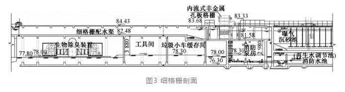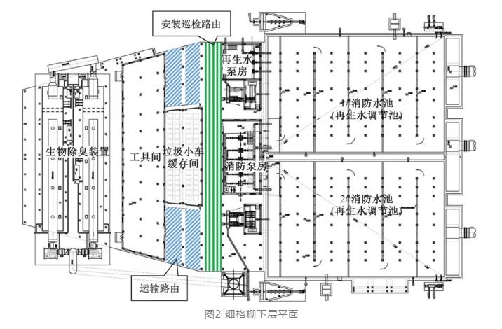 本項(xiàng)目將格柵和沉砂池進(jìn)行合建,該單體集合了粗格柵及提升泵房、細(xì)格柵及曝氣沉砂池、消防泵房、消防水池、再生水泵房、再生水調(diào)節(jié)池、生物除臭裝置、工具間、垃圾小車緩存間,共9種功能單元,見圖1~圖3。設(shè)計(jì)階段對(duì)設(shè)備安裝、巡檢、物料運(yùn)輸路由等影響因素進(jìn)行了重點(diǎn)規(guī)劃。