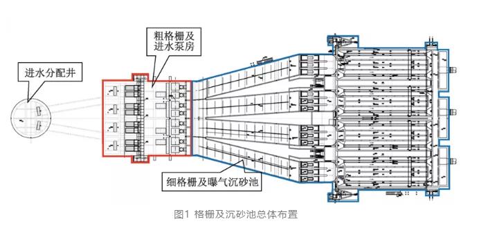 鄭州新區(qū)污水處理廠二期工程格柵和沉砂池土建規(guī)模按照遠(yuǎn)期55萬m3/d一次建成,設(shè)備按照近期35萬m3/d進(jìn)行安裝。本工程將格柵和沉砂池進(jìn)行合建,同時(shí)集合了粗格柵及提升泵房、細(xì)格柵及曝氣沉砂池、消防泵房、消防水池、再生水泵房、再生水調(diào)節(jié)池、生物除臭裝置、工具間、垃圾小車緩存間,共9種功能單元。本項(xiàng)目在設(shè)計(jì)階段充分利用平面和豎向空間,集約化設(shè)計(jì),達(dá)到了節(jié)省占地、降低工程費(fèi)用的目的;并且對(duì)設(shè)備安裝、巡檢、物料運(yùn)輸路由等影響因素進(jìn)行重點(diǎn)規(guī)劃,實(shí)現(xiàn)了整體化、集約化、系統(tǒng)化和人性化的設(shè)計(jì)理念,可供同類工程參考。