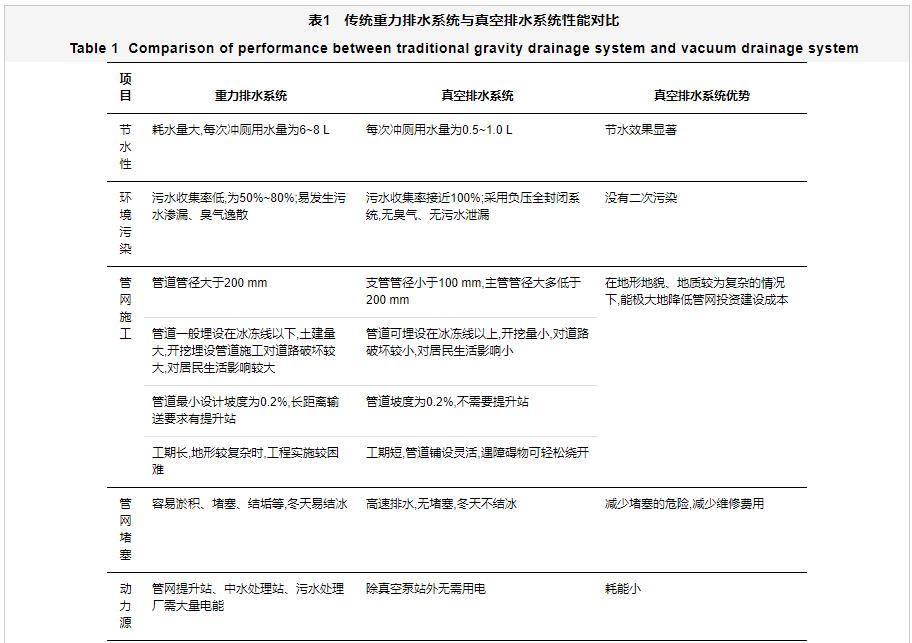 與傳統(tǒng)重力排水系統(tǒng)相比,真空排水系統(tǒng)具有節(jié)水、隔臭、無滲漏、收集率高、密閉性好等優(yōu)點,排水管道具有管徑小、埋深淺、能爬坡、防凍防堵、管道鋪設靈活,不需要設置檢查井,受外部環(huán)境限制程度低,不影響周圍環(huán)境,施工方便快捷、周期短、土建費用低等特點[3,9-10](表1)。