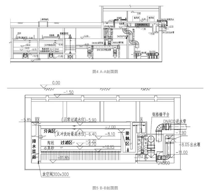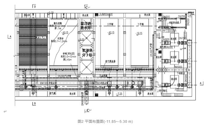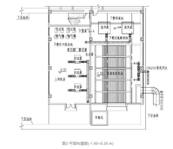 工程地下部分場地面積僅相當(dāng)于普通濾池,需要布置主體處理構(gòu)筑物和地下提升泵房,還需安排上下人流、物流通道。