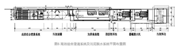 間歇性排放的沉淀池排泥水匯集于收集池內(nèi),通過泵提升后進(jìn)入調(diào)節(jié)池中,對(duì)水量和水質(zhì)做適當(dāng)調(diào)整均化后,進(jìn)入高效組合澄清系統(tǒng)進(jìn)行進(jìn)一步處理。處理后的水經(jīng)過取樣排放池進(jìn)行連續(xù)監(jiān)測(cè)后,利用廠區(qū)原有排放口排放進(jìn)入青龍港河道內(nèi)。處理后的污泥進(jìn)入污泥儲(chǔ)罐后由污泥泵打入疊螺脫水機(jī)進(jìn)行機(jī)械脫水處理,最后對(duì)脫水污泥進(jìn)行外運(yùn)處置。排泥水處理流程如圖5所示,高效組合澄清系統(tǒng)及污泥脫水系統(tǒng)平面布置圖分別如圖6所示。