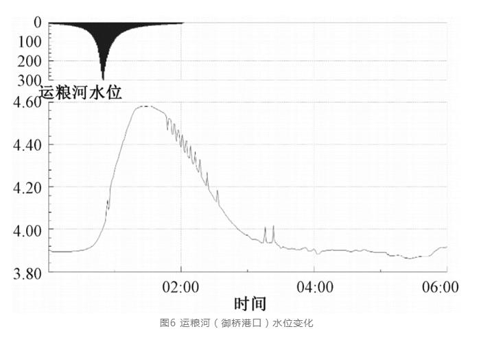 當初始長江水位、金山湖水位和內(nèi)河水位均為3.9m,暴雨強度30年一遇時(短歷時),模擬工況如下:引航道閘、七擺渡閘、焦南閘、丹徒北閘開啟;二擺渡閘在御橋河口水位達到5.7m時開啟,丹徒南閘在四明河口水位達到4.9m時開啟,京口閘在四明河口水位達到5.3m時開啟;通過模型模擬,運糧河在降雨開始1.5h時達到水位最高點約4.6m處,而后緩慢波動下降,如圖6所示。古運河在降雨開始后2h左右達到水位最高點約5.3m處,此時京口閘開啟,水位迅速下降,如圖7所示。金山湖水位從初始水位3.9m逐漸上升,降雨停止后繼續(xù)緩慢上升,由于引航道閘和焦南閘的泄洪作用,金山湖最高水位約4.04m處開始下降。
