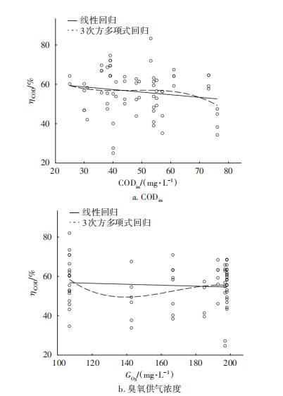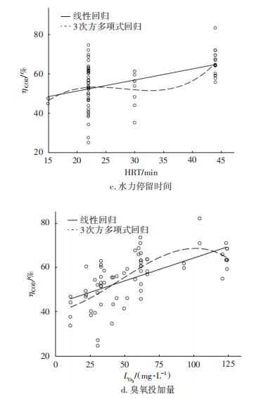 從表2很難定量把握催化臭氧氧化反應(yīng)的整體規(guī)律,這不僅是由于每次試驗取樣和測試分析存在誤差,更為重要的是氧化反應(yīng)為多因素作用。通過運(yùn)用相關(guān)統(tǒng)計軟件進(jìn)行多因素回歸分析,能較容易地找出各工況參數(shù)對工藝效果的影響。