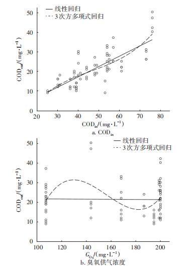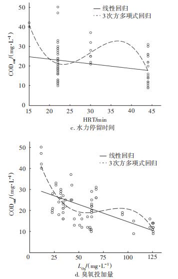 CODin:試驗點非常分散;不僅如此,線性回歸和3次方多項式回歸基本水平(略向下),由此可見進(jìn)水CODin對處理效果影響的規(guī)律性不強(qiáng)。