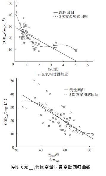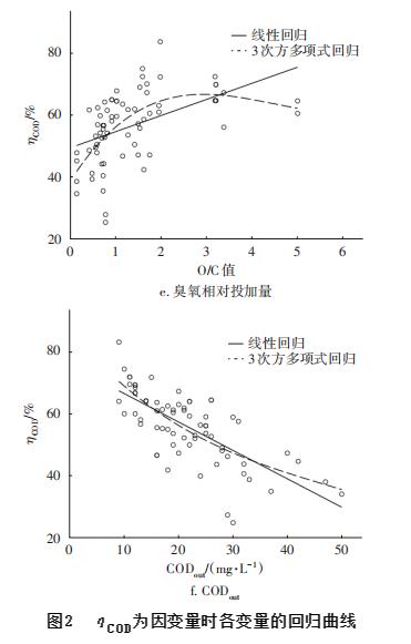 首先把35次試驗中每次試驗的二次取樣測定結(jié)果作為70例“個案”,變量包括CODin、HRT、GO3、LO3、O/C;因變量包括去除率ηCOD和出水濃度CODout。當(dāng)然,這些變量中有的不是獨(dú)立變量,有的對試驗結(jié)果影響不大。首先,以ηCOD為因變量,對上述6個因素進(jìn)行回歸分析,結(jié)果如圖2所示。
