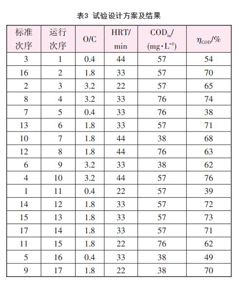 從圖4可以發(fā)現(xiàn),第12次“運(yùn)行”為實際最優(yōu)值,當(dāng)O/C值為1.8、HRT為33min、CODin為57mg/L時,ηCOD達(dá)到72% 。從圖4還可以發(fā)現(xiàn),當(dāng)O/C值大于1.2時,可以保證ηCOD在60%以上;但要達(dá)到更高的去除率,O/C要增加很多,且逐漸趨于極限,因此工程上是不經(jīng)濟(jì)的。