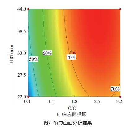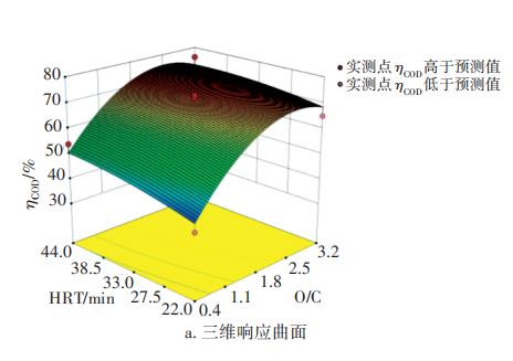 人們往往對“響應(yīng)面分析”感興趣,因為其能全面地反映自變量與因變量的關(guān)系。本研究嘗試運(yùn)用設(shè)計軟件進(jìn)行擬合,采用水力停留時間HRT、臭氧相對投加量O/C兩個主要獨(dú)立自變量,考察ηCOD的響應(yīng)。根據(jù)試驗范圍確定方案,每次的運(yùn)行結(jié)果采用內(nèi)插法分析數(shù)據(jù),個別不在中試范圍的“運(yùn)行”,其數(shù)據(jù)結(jié)果可采用外延法得到,由此得出試驗設(shè)計方案及結(jié)果,見表3。響應(yīng)面分析結(jié)果見圖4。