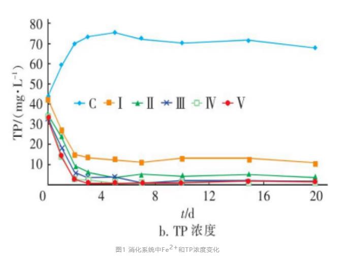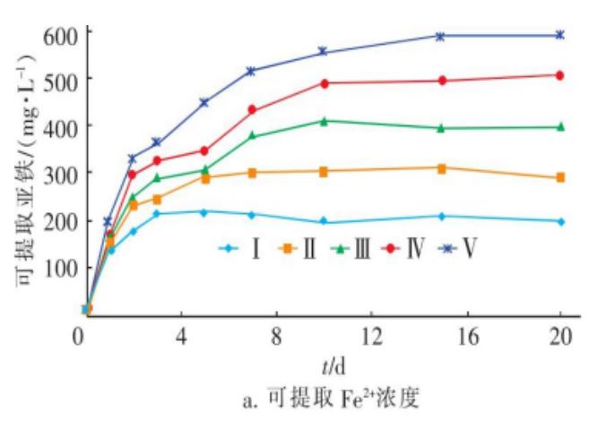 Fe3+在厭氧消化系統(tǒng)中會(huì)被異化金屬還原菌 (DMRB) 還原為Fe2+。如圖a所示隨厭氧消化的進(jìn)行,系統(tǒng)中可提取的Fe2+濃度逐漸升高,在消化結(jié)束時(shí)Ⅰ~Ⅴ系統(tǒng)內(nèi)Fe2+濃度分別為201.4、303.4、402.6、498和580.1mg/L,均接近系統(tǒng)內(nèi)總鐵(TFe)濃度,其中,C組(空白組)中始終未檢測(cè)出Fe2+。試驗(yàn)表明,添加至系統(tǒng)中的Fe3+幾乎100%被還原為Fe2+;被還原的Fe2+主要以化合態(tài)形式存在于污泥中,各系統(tǒng)中溶解態(tài)Fe2+均分布于0~10mg/L濃度范圍內(nèi),且與TFe濃度無明顯關(guān)聯(lián)。