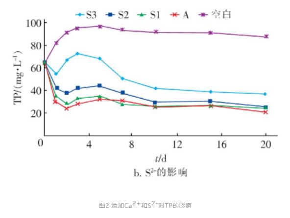 圖2顯示了添加Ca2+與S2-對(duì)反應(yīng)系統(tǒng)內(nèi)TP的影響。宏觀上,添加Ca2+后促進(jìn)了磷的去除,且隨Ca2+濃度的增加系統(tǒng)內(nèi)P濃度降低。Ca2+對(duì)P去除的促進(jìn)作用歸因于Ca2+本身是一種化學(xué)除磷劑,其與PO43-反應(yīng)可生成難溶磷酸鹽,如羥基磷灰石[Ca5(PO4)3OH,HAP]和磷酸鈣。添加S2-對(duì)系統(tǒng)中P去除效果的影響剛好與Ca2+等金屬離子相反,S2-降低了系統(tǒng)對(duì)P的去除效率,而且S2-添加濃度越高則消化系統(tǒng)的除磷效果越差,這是因?yàn)镾2-與Fe2+會(huì)生成難溶性的硫化亞鐵(FeS)以及黃鐵礦(FeS2)。