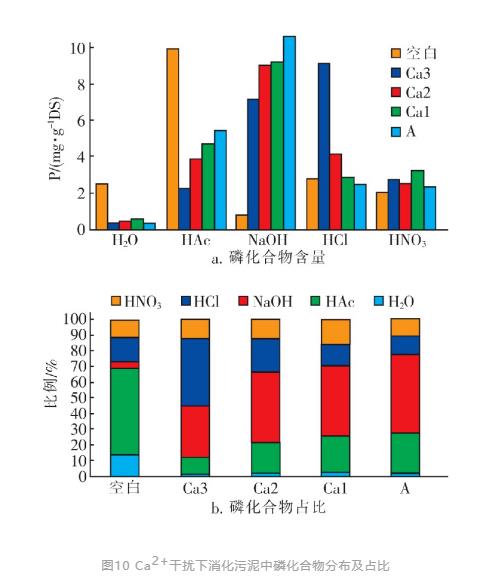 下圖顯示了添加Ca2+后消化污泥中形成的磷化合物分布。HNO3提取P在污泥中含量不是很高,但比較穩(wěn)定,占比在11%~16%之間。這部分P含量與羥基鐵的添加以及Ca2+介入無關(guān),故不對(duì)這部分P含量作更多的分析。NaOH提取P主要包括Fe-P、Al-P及有機(jī)-P。因消化底泥為試驗(yàn)培養(yǎng)的不含Al、Fe元素的活性污泥,所以,空白組污泥中NaOH提取P僅為有機(jī)-P,試驗(yàn)組的NaOH提取磷則包含有機(jī)-P和藍(lán)鐵礦(Fe-P)。試驗(yàn)雖測(cè)試了多種干擾因子影響藍(lán)鐵礦生成,但均采用相同試驗(yàn)/分析方法,Ca2+之外的其他干擾因子影響見表3。Mg2+對(duì)磷化合物種類的影響與Ca2+類似,但抑制程度較Ca2+要弱,主要還是因?yàn)楦髯孕纬傻牧姿猁}產(chǎn)物在溶解度上的差別。表3數(shù)據(jù)顯示,在相同添加濃度條件下,Al3+對(duì)藍(lán)鐵礦生成的抑制程度最大,F(xiàn)e /Al為1∶1時(shí)對(duì)藍(lán)鐵礦生成抑制率達(dá)100%。硫化物對(duì)藍(lán)鐵礦生成的抑制作用是可以被解除的,加入過量鐵鹽即可屏蔽S2-的干擾。HA對(duì)Fe2+的吸附絡(luò)合可阻礙PO43-與Fe2+反應(yīng),抑制藍(lán)鐵礦生成。