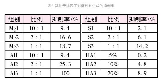 (5)各干擾因子對(duì)藍(lán)鐵礦生成的抑制程度順序?yàn)? CO32-<HA<S2-<Mg2+<Ca2+<Al3+。