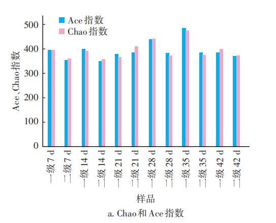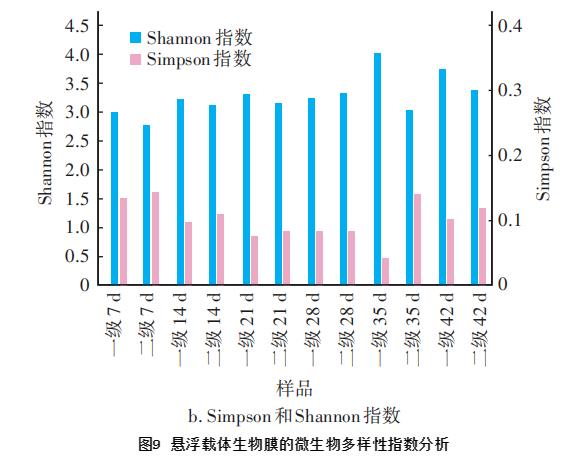 以Chao和Ace指數(shù)表征樣品物種的豐富度,指數(shù)值越大,說明該樣本物種數(shù)越多。如圖9(a)所示,整個研究階段,生物膜的Chao和Ace指數(shù)均無明顯變化趨勢,但除第21天外,其他時間一級生物膜的Chao和Ace指數(shù)均高于同期二級生物膜。可見,系統(tǒng)在啟動初期生物膜的物種豐富度就達(dá)到了較高水平,但受進(jìn)水負(fù)荷的影響,一級生物膜優(yōu)先發(fā)揮污染物去除作用,致使其物種豐富度高于二級生物膜。