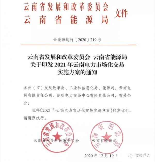 2020年的12月19日,云南省發(fā)改委和能源局聯(lián)合下發(fā)了《2021年云南電力市場(chǎng)化交易方案》,僅僅不到兩周,就完成了2021年度電力市場(chǎng)中長期交易成交合同,交易電量1248億kwh,同比前三年平均電量的135.7%,對(duì)廣大電源企業(yè)還是用戶都吃一顆定心丸。
